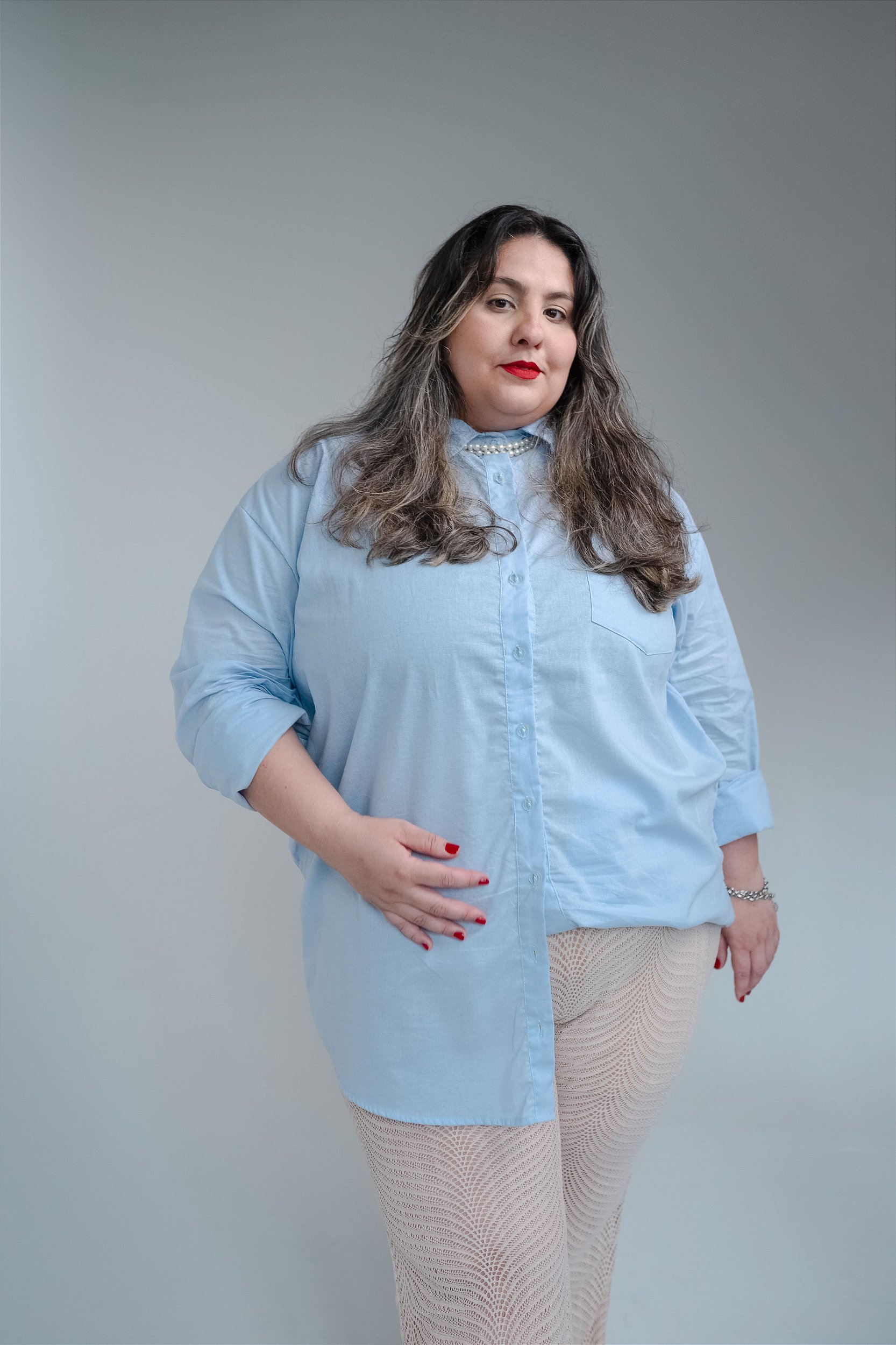 No tom azul claro, a peça transmite frescor e sofisticação, ideal para composições casuais, office look ou produções mais arrumadas com alfaiataria.